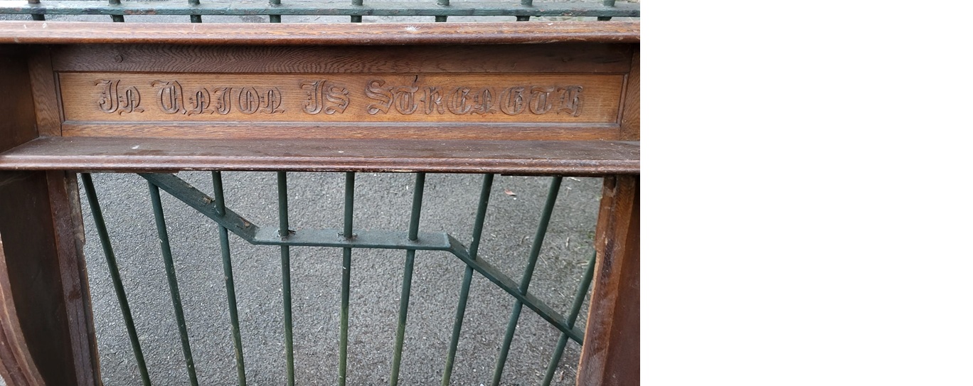 Arts & Crafts oak fire surround with carved phrase reading: In Union Is Strength.