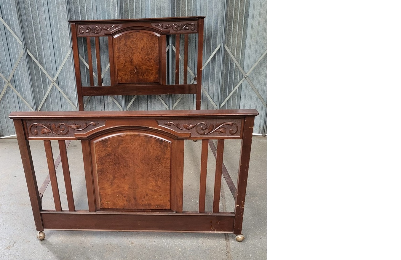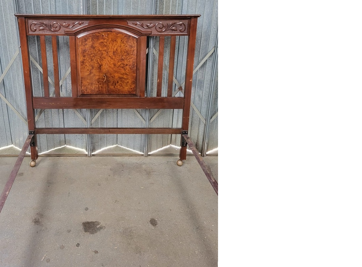 Unrestored 4ft6 Edwardian carved walnut bedstead with burr walnut centre panel.