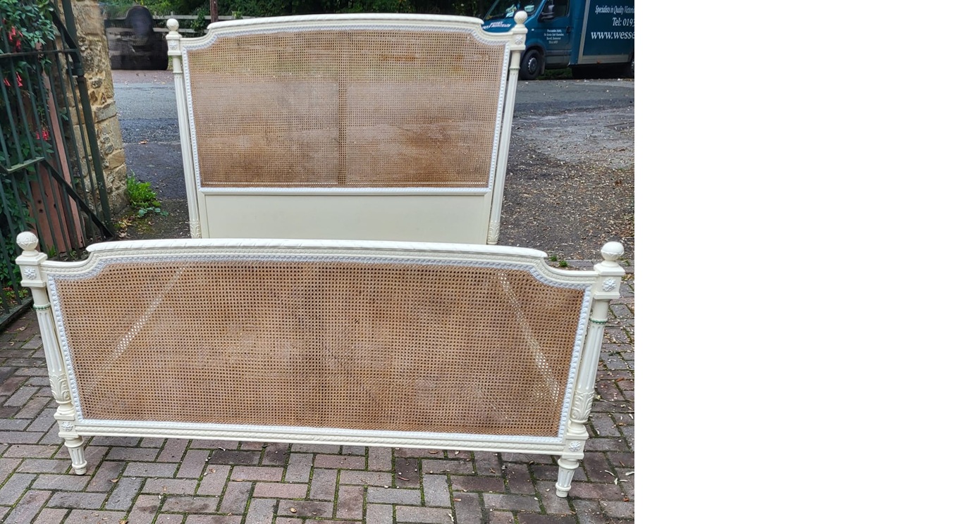 Unrestored 6ft French painted bergere bedstead, ca 1900.