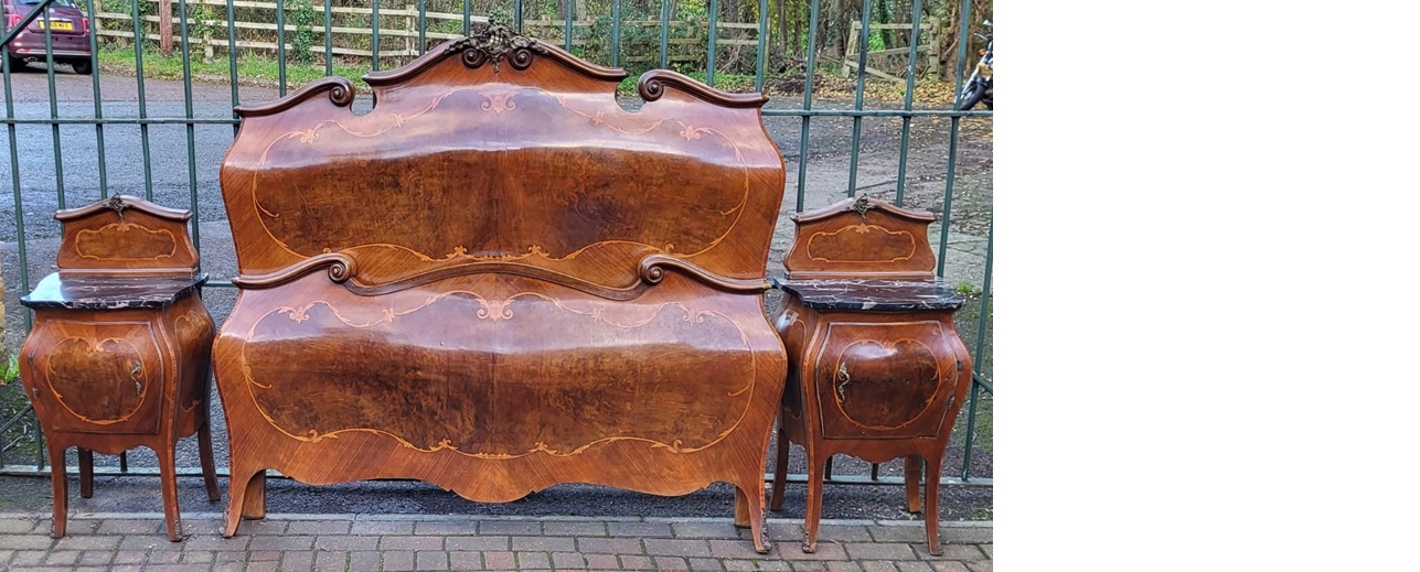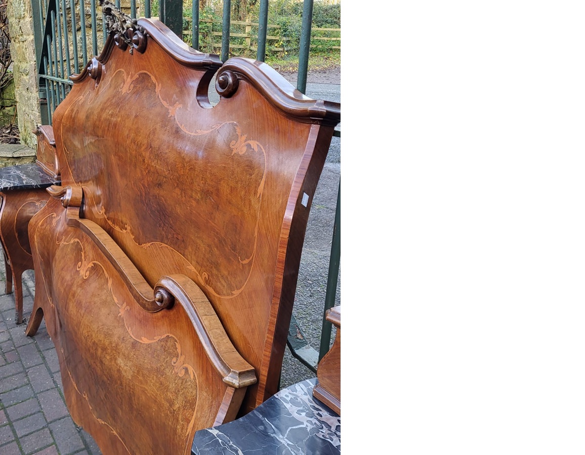 Unrestored very elegant and curvaceous 5ft6 Italian ormalou mounted Bombe bedstead with ensuite pair of marble top bedside cabinets, ca. 1900.