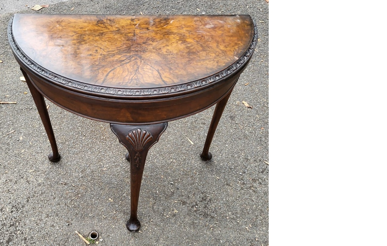 Queen Anne Style carved burr walnut Demi Lune fold over card table.