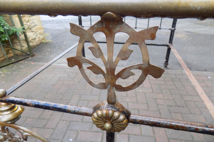 Unrestored 4ft6 Victorian brass and iron bedstead with decorative brass pressings and cast brass details.