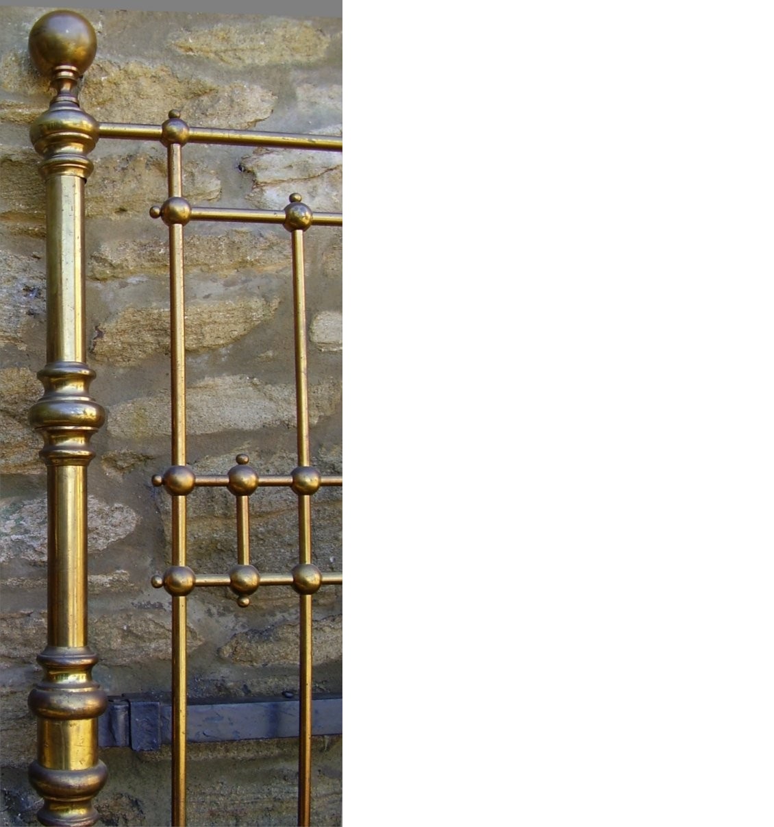 Unrestored fabulous king size Victorian brass bedstead with protruding etched brass panel on the foot end depicting love birds.