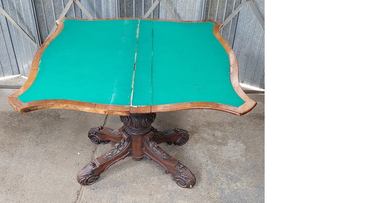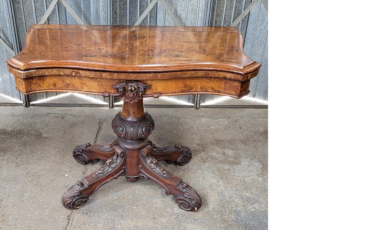 Victorian burr walnut fold over card table on carved column and outswept legs.