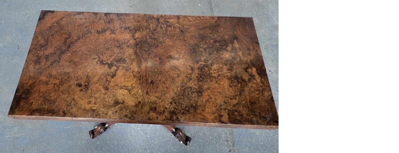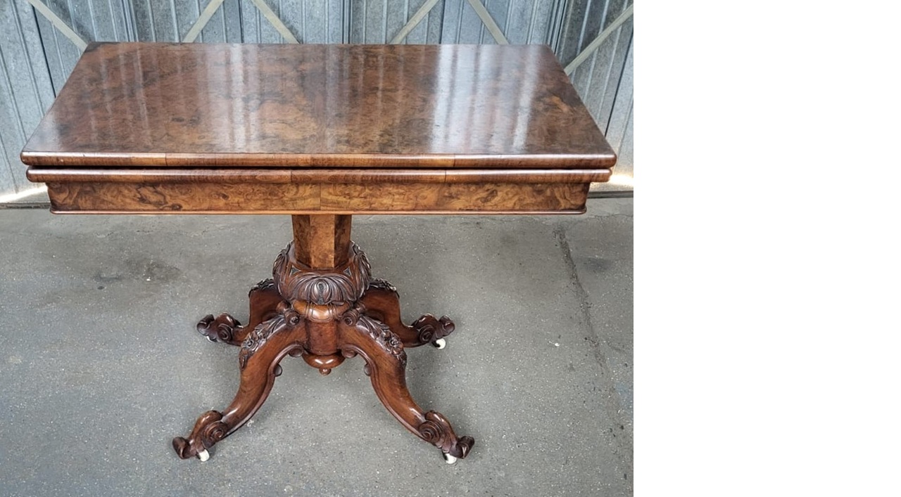 Victorian burr walnut fold over card table carved and turned column resting on carved outswept legs.
