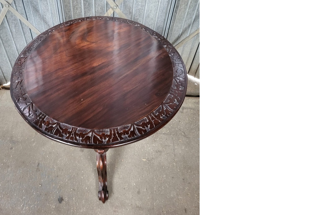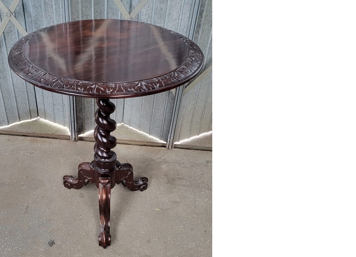 Victorian carved walnut round table with lovely turned column on a tripod base.