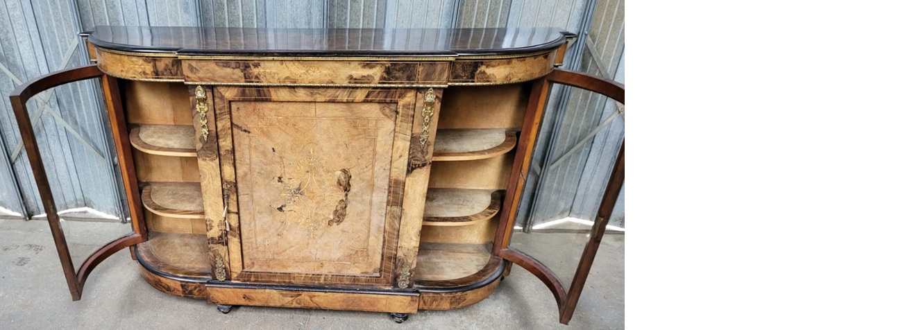 Fine quality Victorian inlaid burr walnut three door credenza with ormalou mounts, ca 1870.