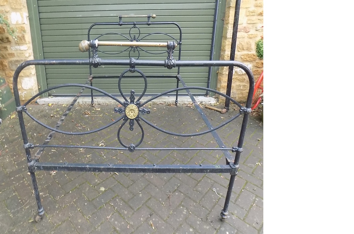 Unrestored 4ft6 Victorian iron bedstead with short top brass bar.