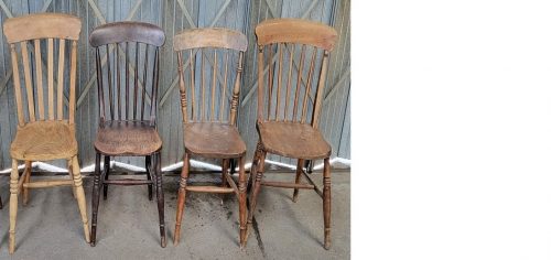 Victorian Harlequin Set of Four Elm Slat Back Kitchen Chairs